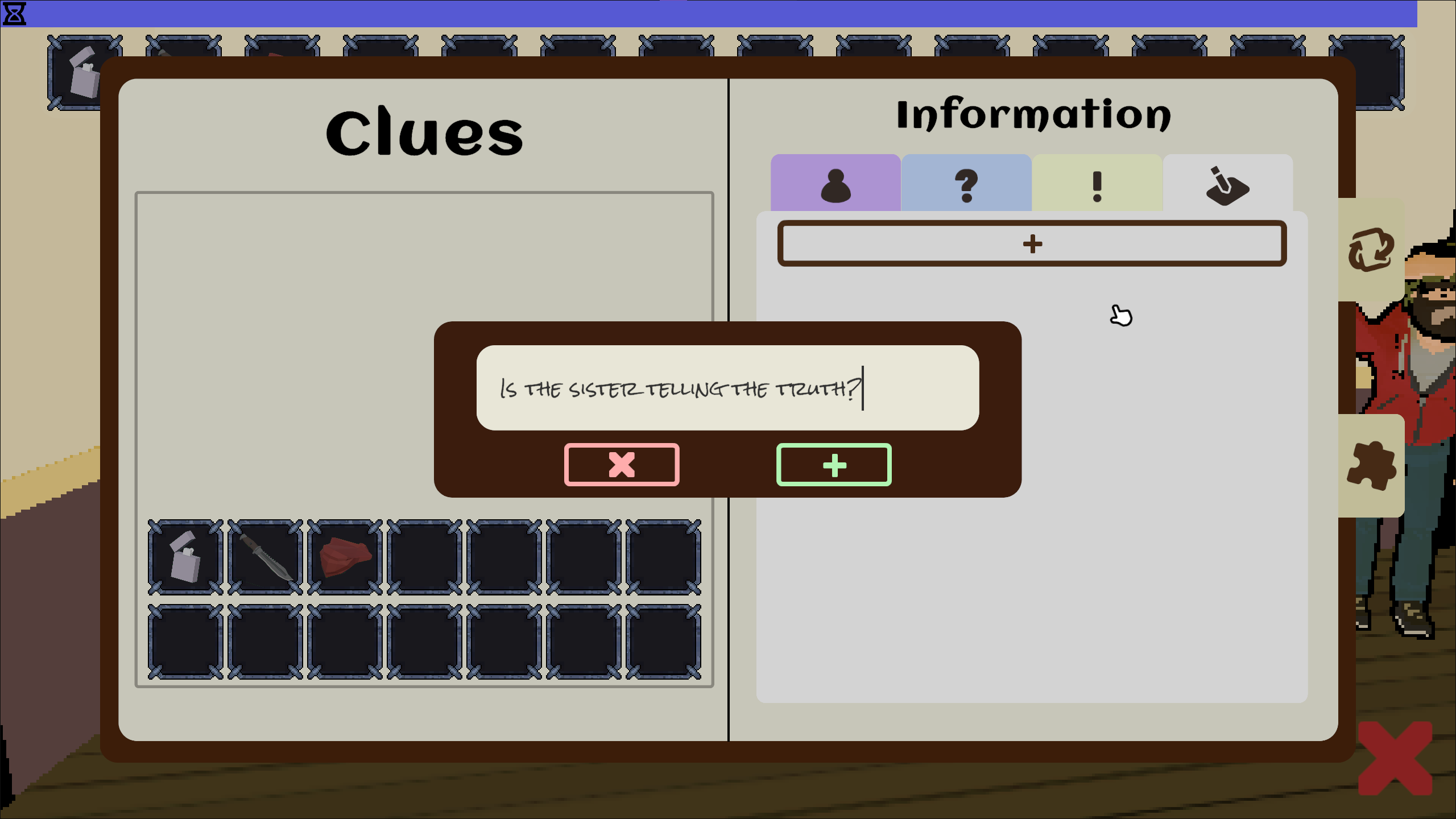 - New solve mystery phase -> Once you have enough evidence, it will be time to present it to the police to convince them of your theories and keep the case open. This new phase is meant to replace the current "solve case" tab in the notebook, making it more integrated with the world and the characters. Just like the conversation system, it is going to be inspired by the Ace Attorney saga.